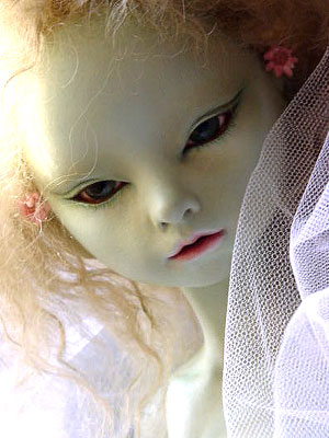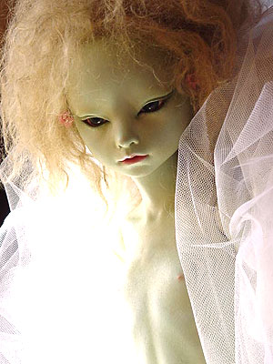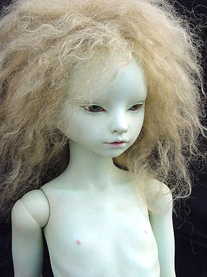 NO.08 (Size 50cm) 妖精っぽい肌ですが、人間の女の子です。 初めは普通の肌色にしようと思っていたのですが、 仕上がってみたらかなりブルーになっていました。 個人的には何か考えていそうな目元が 気に入っています。 製作期間2003年5月〜10月